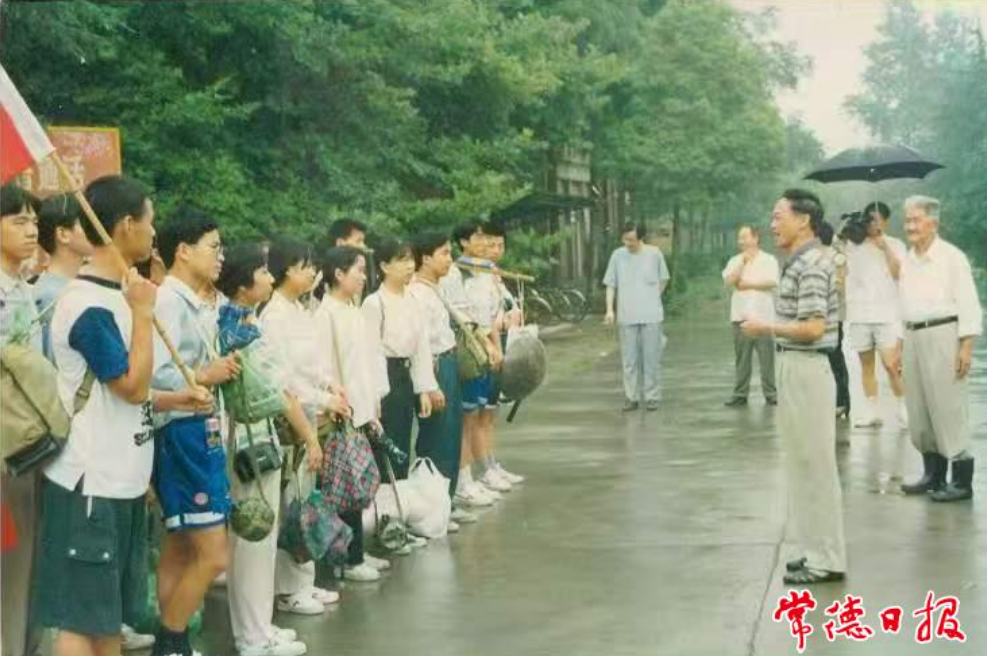 1997年上井冈山前,时任校长许成林、革命老人杜修经为实践教学队伍送行